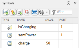 Panel Symbols: un panel, situado de forma predeterminada a la derecha del área de diseño, en el que se crean y gestionan datos, eventos y mensajes que permiten que el gráfico se comunique con el resto del modelo de Simulink.