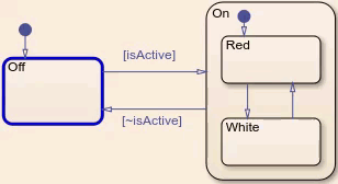 Por ejemplo, en este modelo de las luces de emergencia de una ambulancia, el estado On tiene los estados secundarios Red y White. Cuando On se activa, la ambulancia alterna las luces de colores, comenzando con el estado Red. Cuando On se desactiva, ambas luces se desactivan.