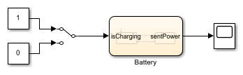 ChargecomoFastChargeestán activos. A medida quechargeaumenta, el gráfico pasa a los estados secundariosSlowChargeyFull. En el panel Symbols,chargenunca supera100.Regrese al modelo de Simulink de nivel superior. Alterne el valor del bloque Manual Switch haciendo doble clic en el bloque.