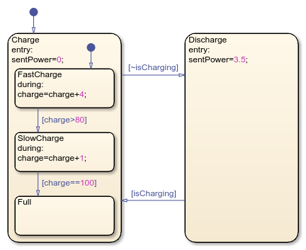 En este ejemplo, puede utilizar estados secundarios para modelar las velocidades de carga variables de un sistema de baterías recargables.