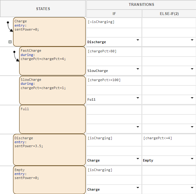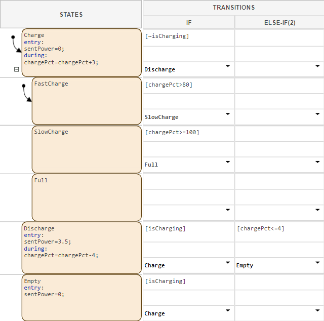 ChargeandFastChargestates both activate. Aschargeincreases, the table transitions to child statesSlowChargeandFull.