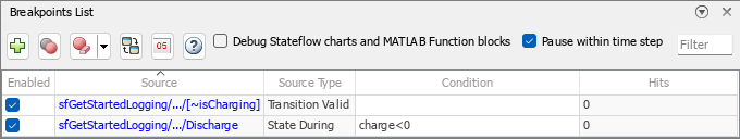 ChargeaDischargey haga clic en Set Breakpoint. El punto de interrupción se activa cuando el gráfico avanza por la transición.En la pestaña Debug, haga clic en Breakpoints List.
