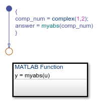 Chart that calls MATLAB function myabs with a complex operand, u.