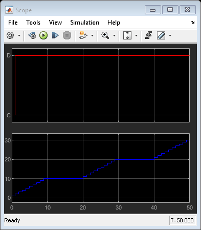 El gráfico Callee contiene dos estados: C y D. Cada vez que el gráfico se ejecuta, los datos de salida y aumentan en uno. El estado C está activo inicialmente. Después de una unidad de tiempo, el valor de y es positivo y el gráfico realiza la transición al estado D.