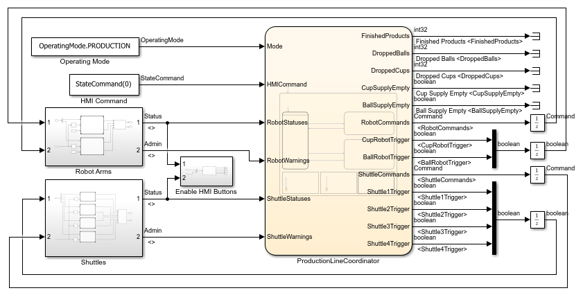 In the top-level model, the ProductionLineCoordinator chart synchronizes the operation of the robots and shuttles. For example, when a user presses a button in the dashboard to change the operating mode, the ProductionLineCoordinator chart sends the appropriate signal to every robot and shuttle.