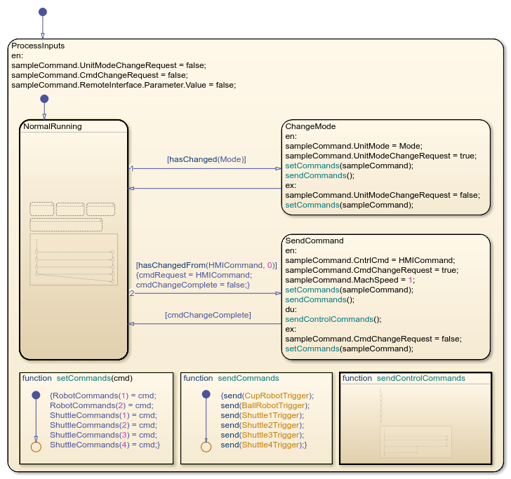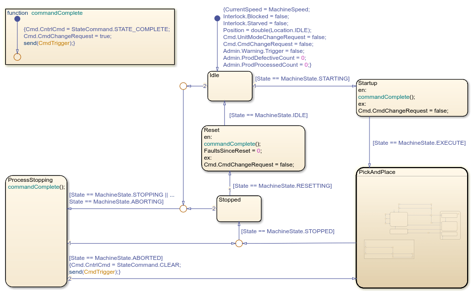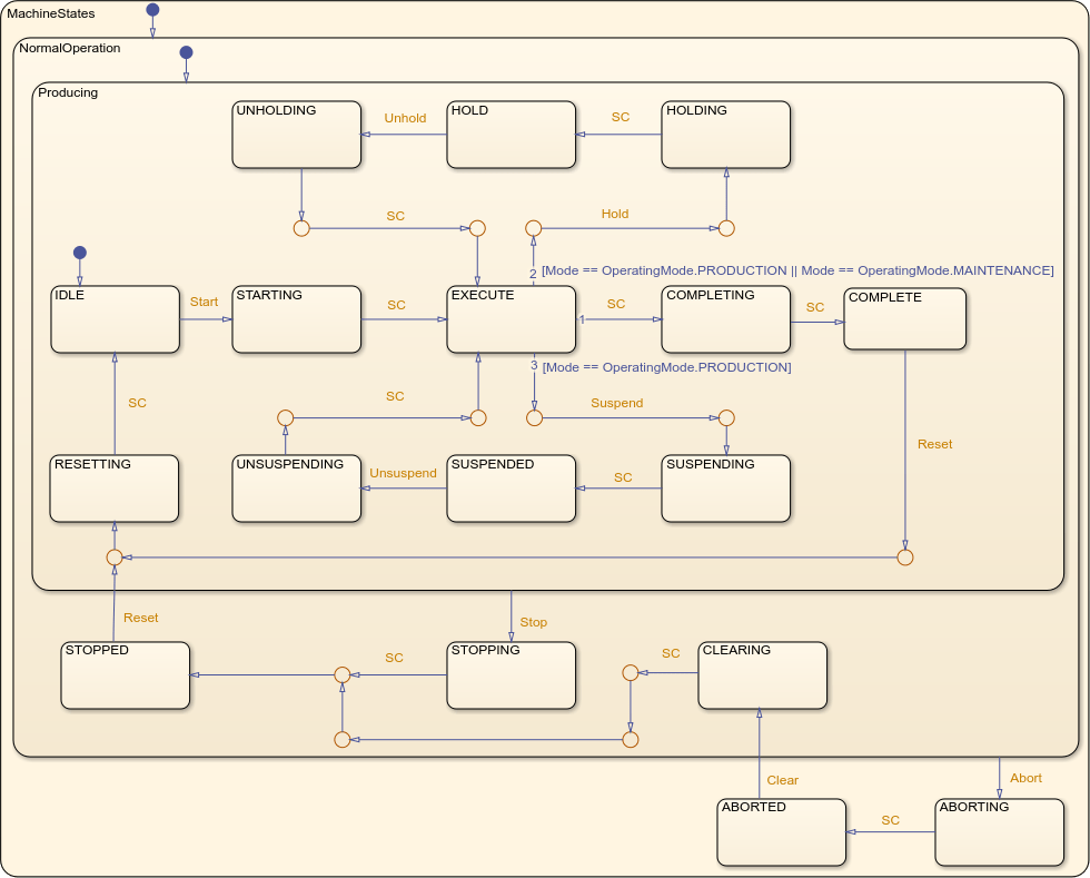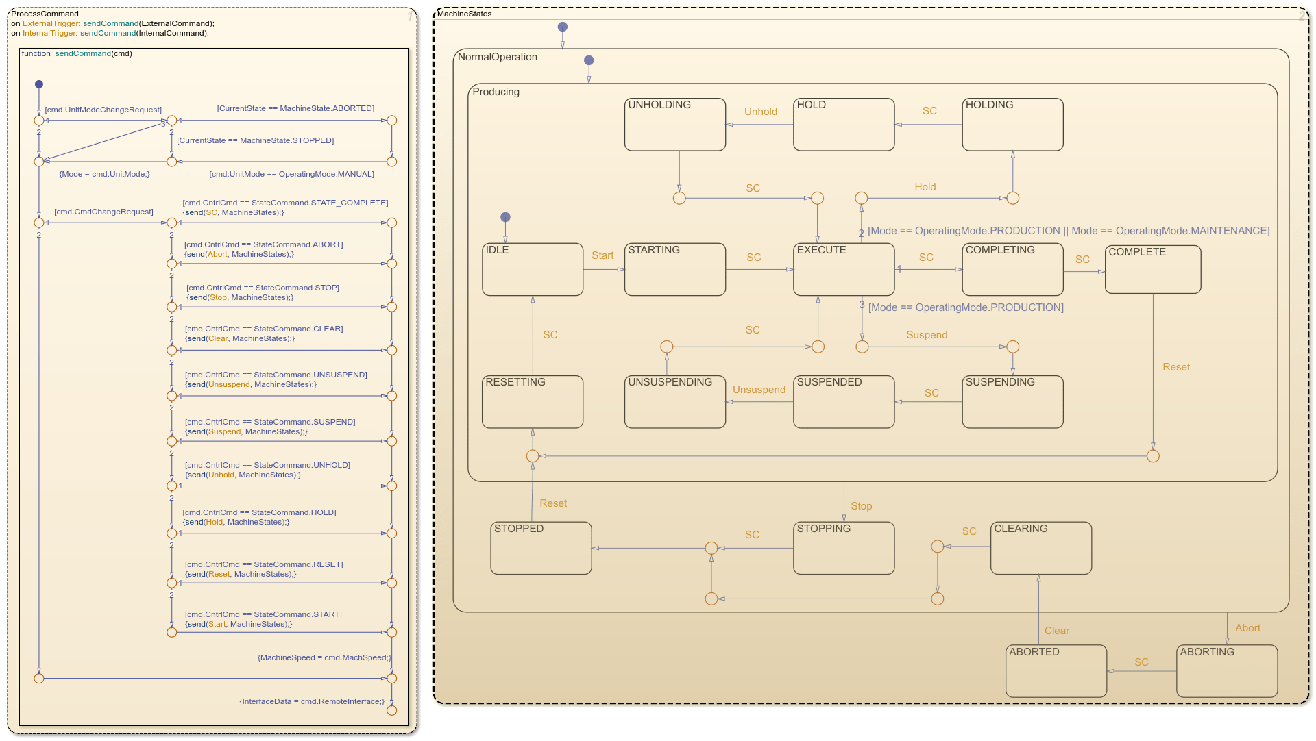 The MachineStates subchart tracks which operating mode from the PackML standard is active. The transitions in the subchart are guarded by events. When the chart receives the appropriate event from ProcessCommand, it moves along the transition.