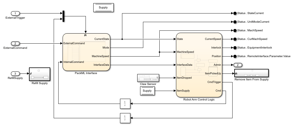 To observe how the model uses PackML, from the top-level model, open the Robot Arms > Cup Robot subsystems, then open the PackML Interface chart. All robot and shuttle subsystems contain the PackML Interface chart.