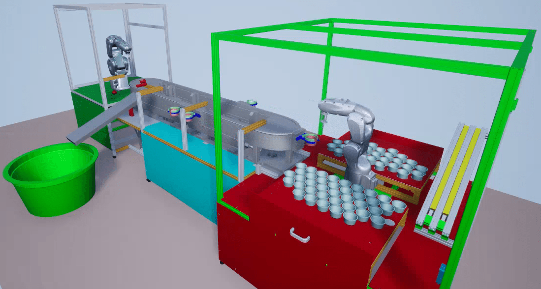 The model simulates common faults in the manufacturing process, such as dropped items or an empty supply.