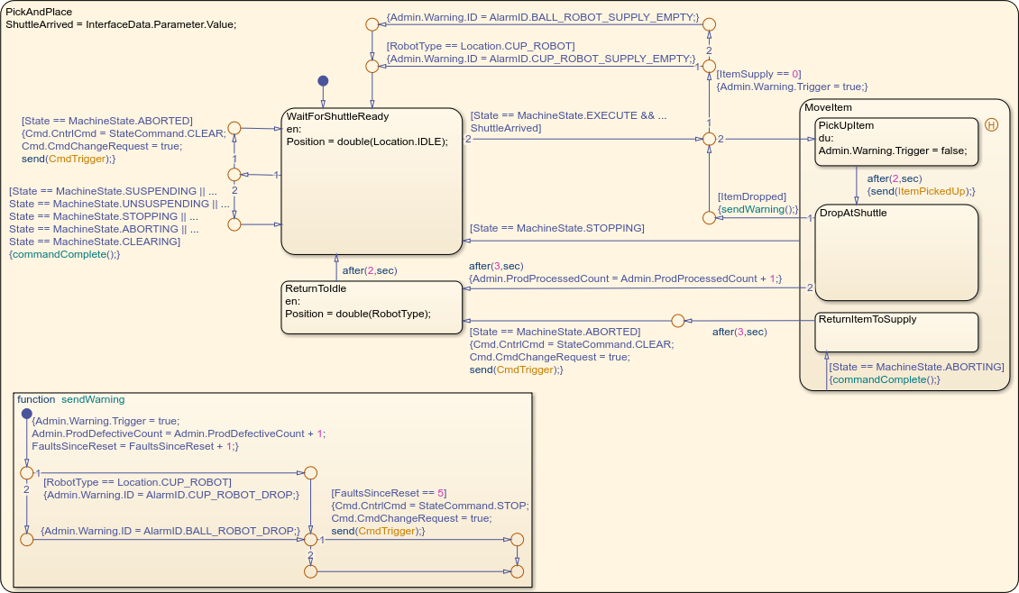 Like the Robot Arms subsystem, the PackML Interface chart determines the state according to the PackML standard, while the ShuttleControlLogic chart uses the state to determine actions for the shuttle.