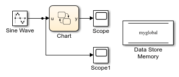 In this model, a Sine Wave block and a Data Store Memory block supply data to a chart.
