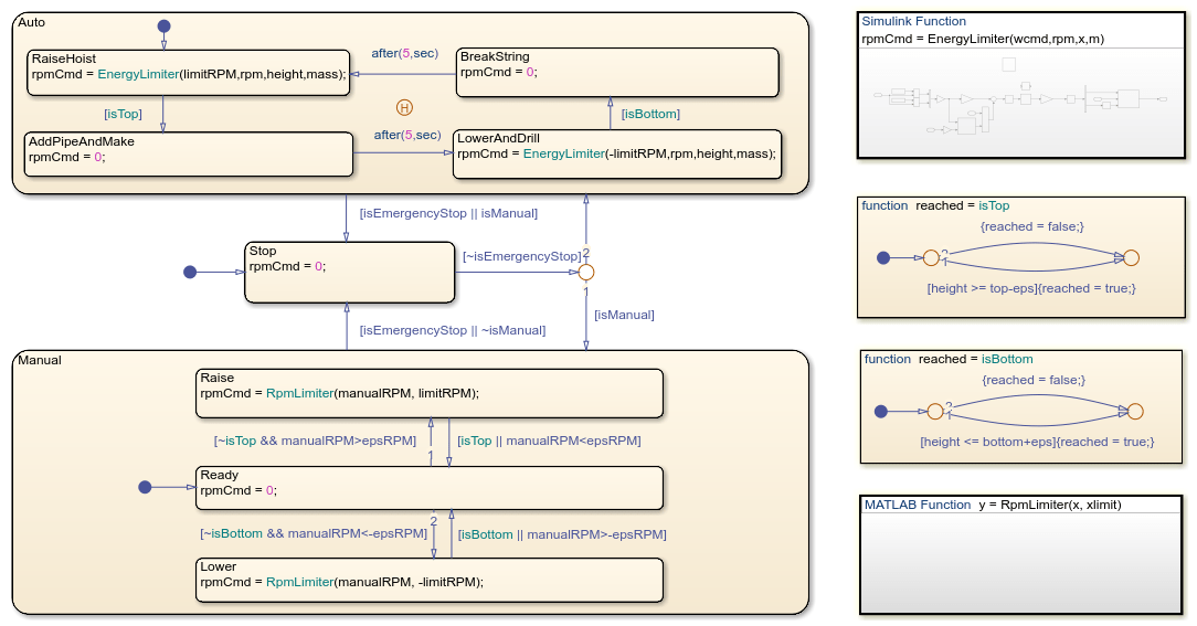The Auto state represents the automatic control mode for the drill. When the chart first enters Auto, it begins in the child state RaiseHoist, which raises the drill. When the drill reaches the top of the rig, the chart transitions to the AddPipeAndMake state, which adds a pipe segment. Then, the chart transitions to the LowerAndDrill state, which lowers the drill, then to the BreakString state, which disconnects the current top segment. Finally, the chart returns to the RaiseHoist state.