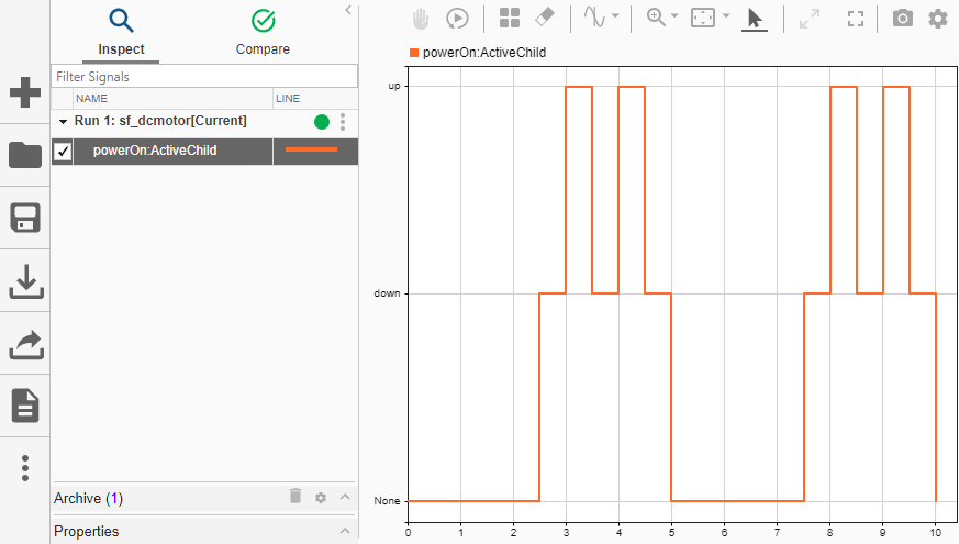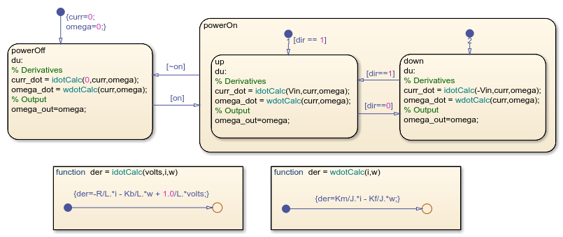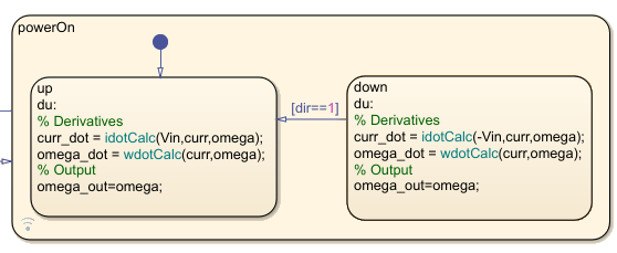 La dinámica del motor se define directamente en el gráfico de estados mediante funciones gráficas y cambia según el estado del motor. Por ejemplo, cuando el motor está en estado powerOff, la tensión aplicada es igual a cero. Cuando el motor está en estado powerOn, la tensión aplicada es positiva o negativa, según la dirección del motor.