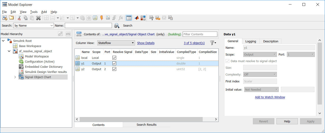 y1tiene estas propiedades: Tipo =double, Dimensiones =1y Clase de almacenamiento =Model default.y2tiene estas propiedades: Tipo =uint32, Dimensiones =[2 2]y Clase de almacenamiento =Auto.localtiene estas propiedades: Tipo =single, Dimensiones =1y Clase de almacenamiento =ExportedGlobal.