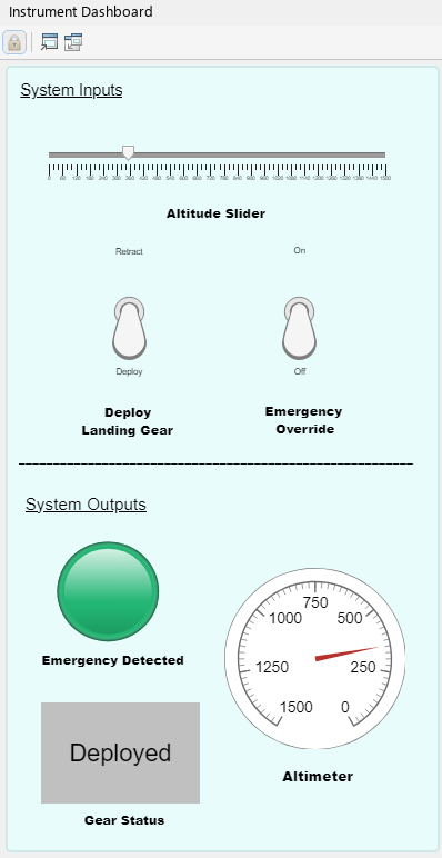 The upper half of the Instrument Dashboard panel contains Dashboard blocks that control the system inputs. You can use the slider to adjust the altimeter and toggle switches to deploy the landing gear or override an emergency situation.