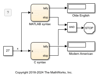 Cuando se simula este gráfico con una entrada de x = 27, el bloque Display Olde English muestra un recuento de 4. La ventana de Diagnostic Viewer muestra los siguientes resultados:
