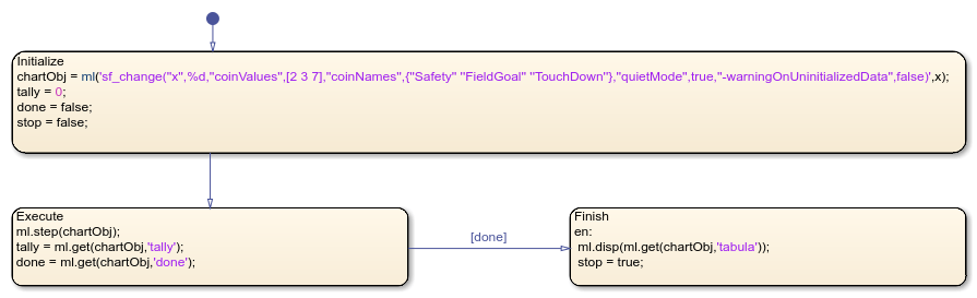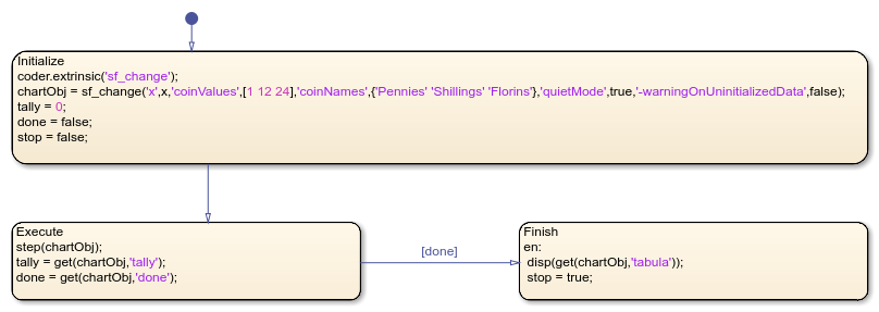 Para ejecutar el algoritmo para contar cambio hasta el final, debe ejecutar el gráfico independiente varias veces. Por ejemplo, el script de MATLAB sf_change_script.m crea un objeto de gráfico chartObj e inicializa el valor de los datos locales x en 27. La opción de configuración '-warningOnUninitializedData', que el script establece en false, elimina la advertencia de que tabula es un arreglo vacío en el nuevo objeto de gráfico. El bucle while ejecuta el gráfico hasta que los datos locales done se convierten en true. Finalmente, el script muestra el valor de tabula.