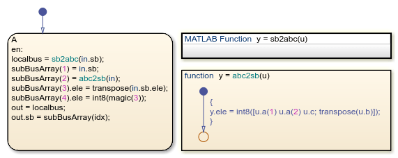 La función sb2abc de MATLAB® toma un bus de Stateflow de tipo SubBus y devuelve un bus de Stateflow de tipo BusObject. La función descompone el valor del campo ele de su entrada en tres componentes: un vector, una matriz 3 por 2 y un escalar. La función almacena estos componentes en un local de MATLAB que tiene los mismos campos que el objeto structBusObject de Simulink.Bus. A continuación, la función asigna el valor de struct de MATLAB al bus de salida y.