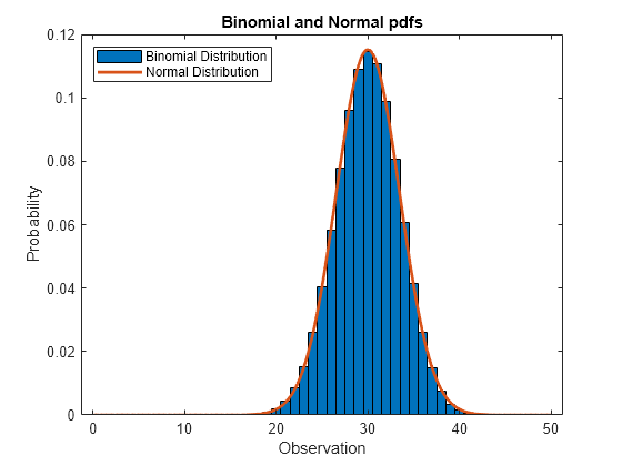figure bar(x1,y1,1) hold on plot(x2,y2,'LineWidth',2) xlabel('Observation') ylabel('Probability') title('Binomial and Normal pdfs') legend('Binomial Distribution','Normal Distribution','location','northwest') hold off