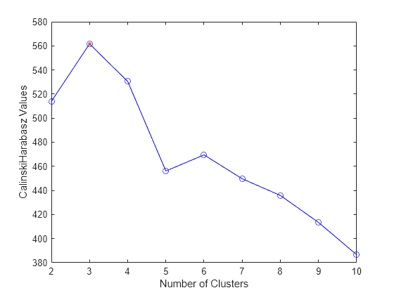 eva = evalclusters(X,'kmeans','CalinskiHarabasz','KList',1:10)