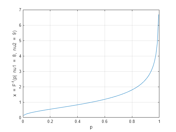 finves una función específica para la distribución F. Statistics and Machine Learning Toolbox™ también ofrece la función genéricaicdf, que es compatible con varias distribuciones de probabilidad. Para utilizaricdf, especifique el nombre de la distribución de probabilidad y sus parámetros. Tenga en cuenta que la función específica de distribuciónfinves más rápida que la función genéricaicdf.