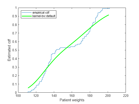 pts = (min(hospital.Weight):2:max(hospital.Weight)); figure() ecdf(hospital.Weight) hold on [f,xi,bw] = ksdensity(hospital.Weight,pts,'Support','positive',... 'Function','cdf'); plot(xi,f,'-g','LineWidth',2) legend('empirical cdf','kernel-bw:default','Location','northwest') xlabel('Patient weights') ylabel('Estimated cdf')