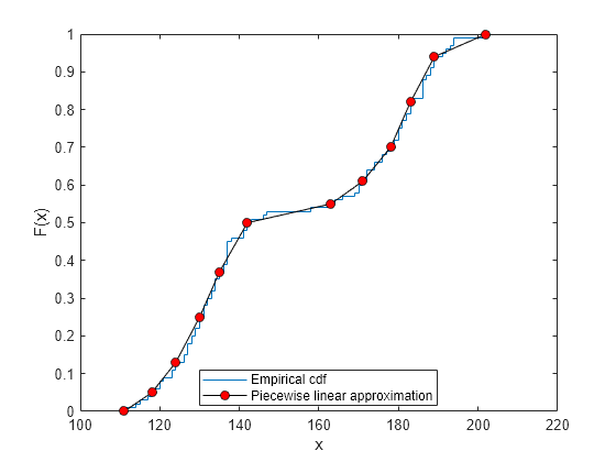 La distribución lineal por tramos es una distribución de probabilidad no paramétrica creada mediante una representación lineal por tramos de la función de distribución acumulativa (cdf). Las opciones especificadas para la distribución lineal por tramos especifican la forma de la cdf. La función de densidad de probabilidad (pdf) es una función escalonada.