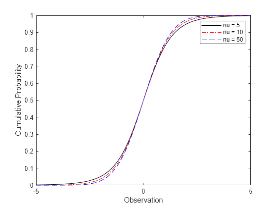 figure; plot(x,y1,'Color','black','LineStyle','-') hold on plot(x,y2,'Color','red','LineStyle','-.') plot(x,y3,'Color','blue','LineStyle','--') xlabel('Observation') ylabel('Cumulative Probability') legend({'nu = 5','nu = 10','nu = 50'}) hold off