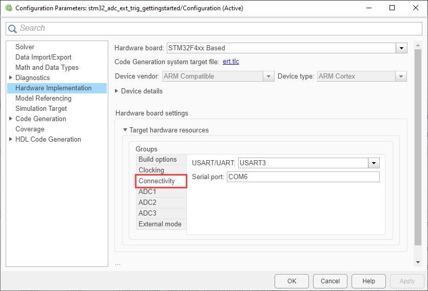 Serial Configuration for Monitor & Tune and PIL for STM32 Processor-Based Boards