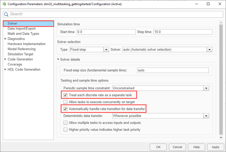 2. Open the Modeling tab and press CTRL+E to open the Configuration Parameters dialog box. Go to Solver and enable the Treat each discrete rate as separate task and Automatically handle rate transition for data transfer parameters.