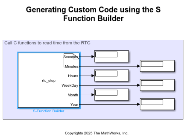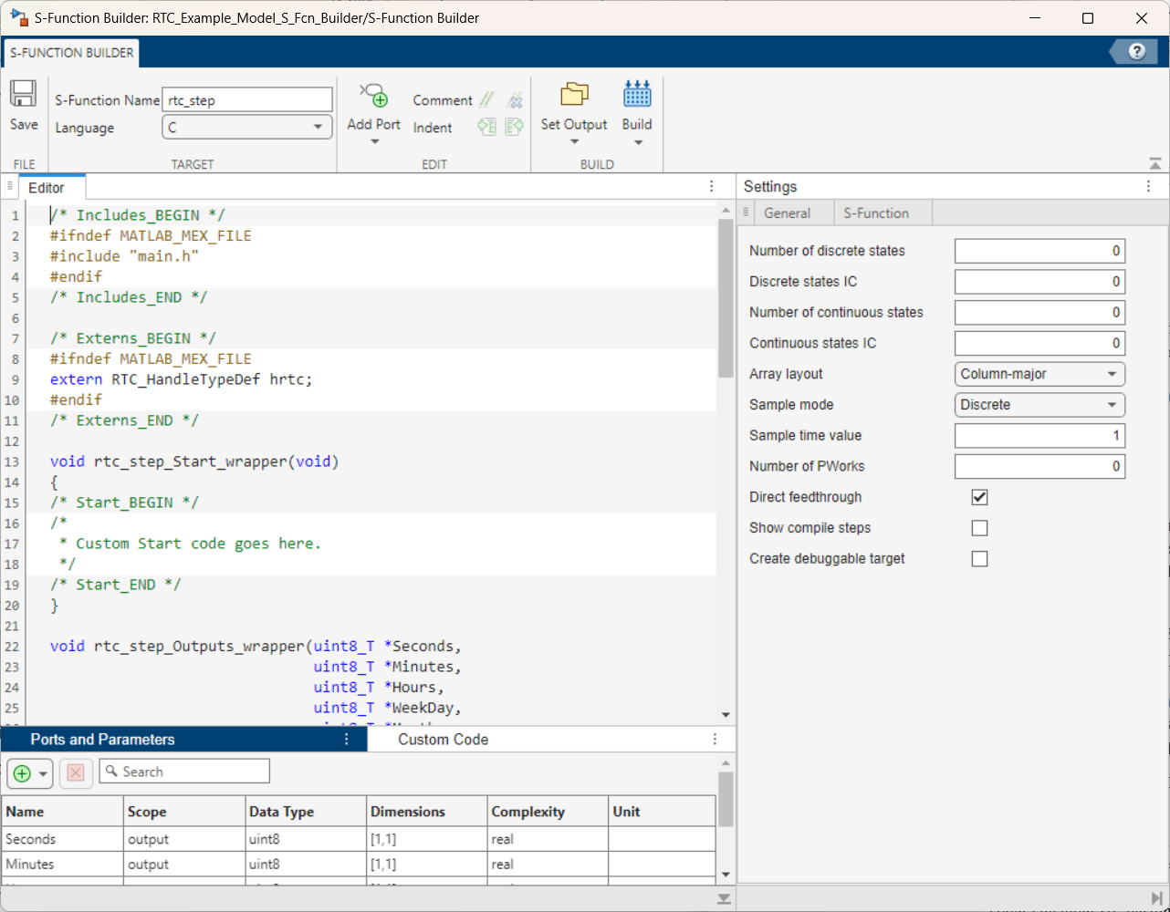 The model RTC_Example_Model_S_Fcn_Builder.slx uses an S-Function created with the S-Function Builder.