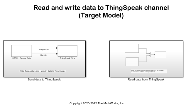 This task sends this data to a ThingSpeak channel for analysis. In this example, the target model collects the same data from the same channel and uses the host model running on the host computer to display the collected temperature and relative humidity data.