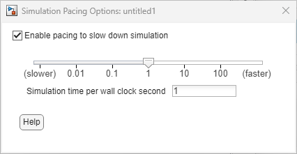 In the Simulink Toolstrip, on the Simulation, Debug, or Modeling tab, click the Run button arrow. Then, select Simulation Pacing. Select Enable pacing to slow down simulation and adjust the pacing time value to