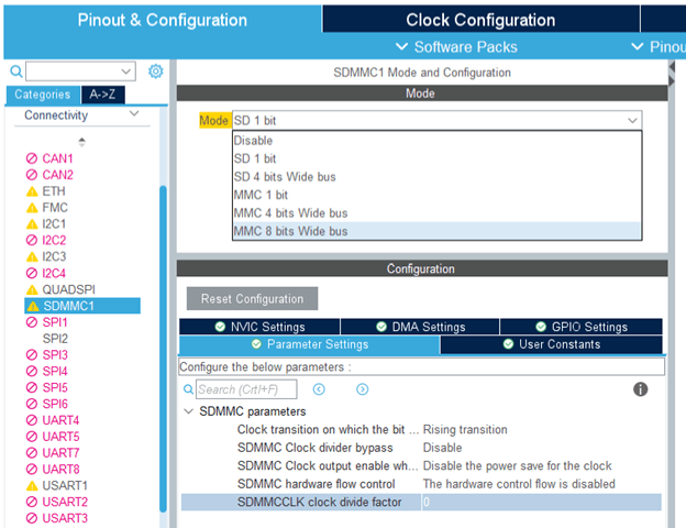 Modeas SD x bit xxxx for the interface mentioned in the model configuration settings.Provide a clock divide factor such that the clock to the peripheral is 187kHz and 24MHz. Also sometimes the sd card logging may not work for smaller values of divide factor. So in that scenario, increase the clock divide factor. A clock factor of 10 can be taken as rough value to start with.
