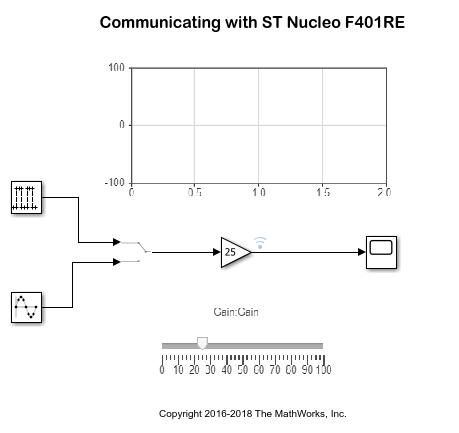The provided model is pre-configured for the STMicroelectronics Nucleo F401RE board. You can run this model on any of the boards listed in the "Supported Hardware" section, by changing the Configuration Parameters > Hardware Implementation > Hardware board of the model. However, for STMicroelectronics Nucleo F031K6, External mode is not supported because of the memory constraint of the processor.