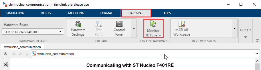 STM32™ Microcontroller Blockset enables you to monitor and tune algorithms running on STMicroelectronics Nucleo board from the same Simulink models from which you developed the algorithms.
