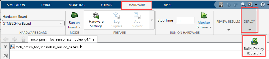 • Try running the example using mcb_pmsm_foc_sensorless_nucleo_g474re model on STM32G4xx Based hardware board.