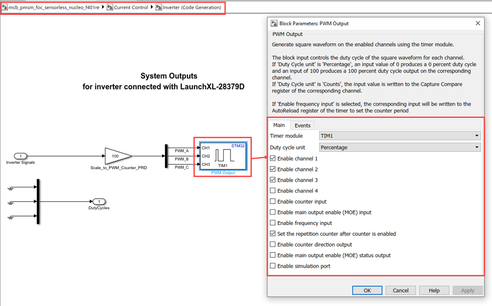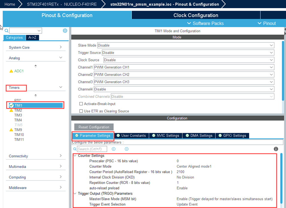 • PWM frequency and PWM channels are configured. The Timer1 is configured to generate update events to synchronize the ADC with the PWM. This synchronization is important to read current feedback at right time.