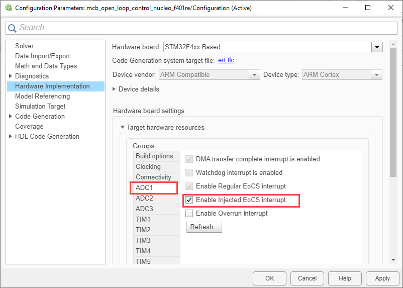 Double-click the blocks to open the block parameter configurations. Ensure the specified parameter values are the same if you want to run this example on a different hardware board.