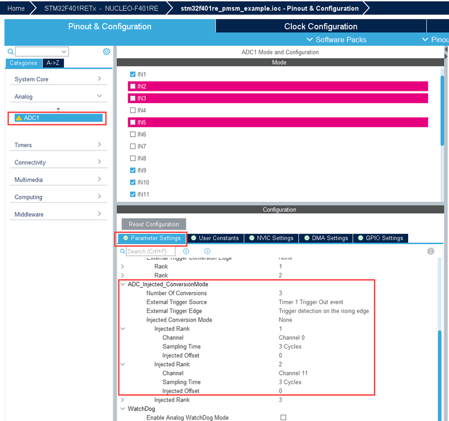 • The ADC channel is configured to read current feedback from the injected group conversions of ADC 1 and the reference speed from regular group conversions.