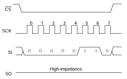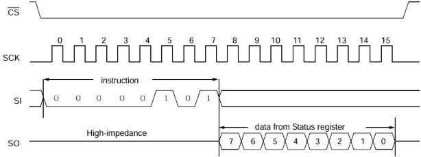 1. Drive CS line low → Send 0x05 (RDSR) → Send a dummy byte (0x00) to read the 8-bit register value.