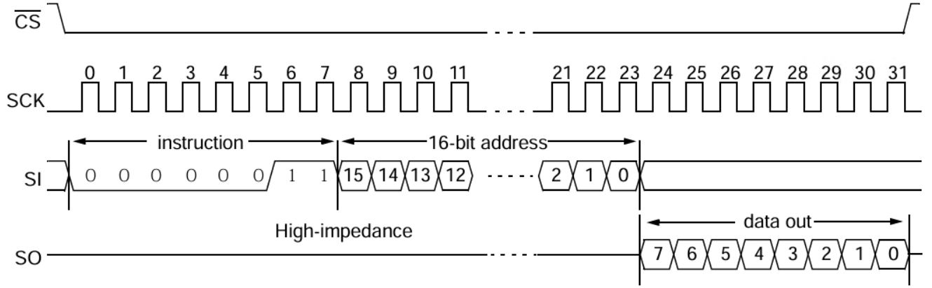 1. Pack read command (0x03) + 16-bit start address + 32-byte dummy data.