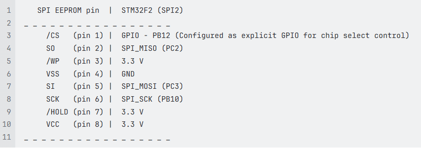 In this example, the STM32 Nucleo F207ZG board (acting as SPI controller) connects to a 25AA080 SPI EEPROM chip using SPI2.
