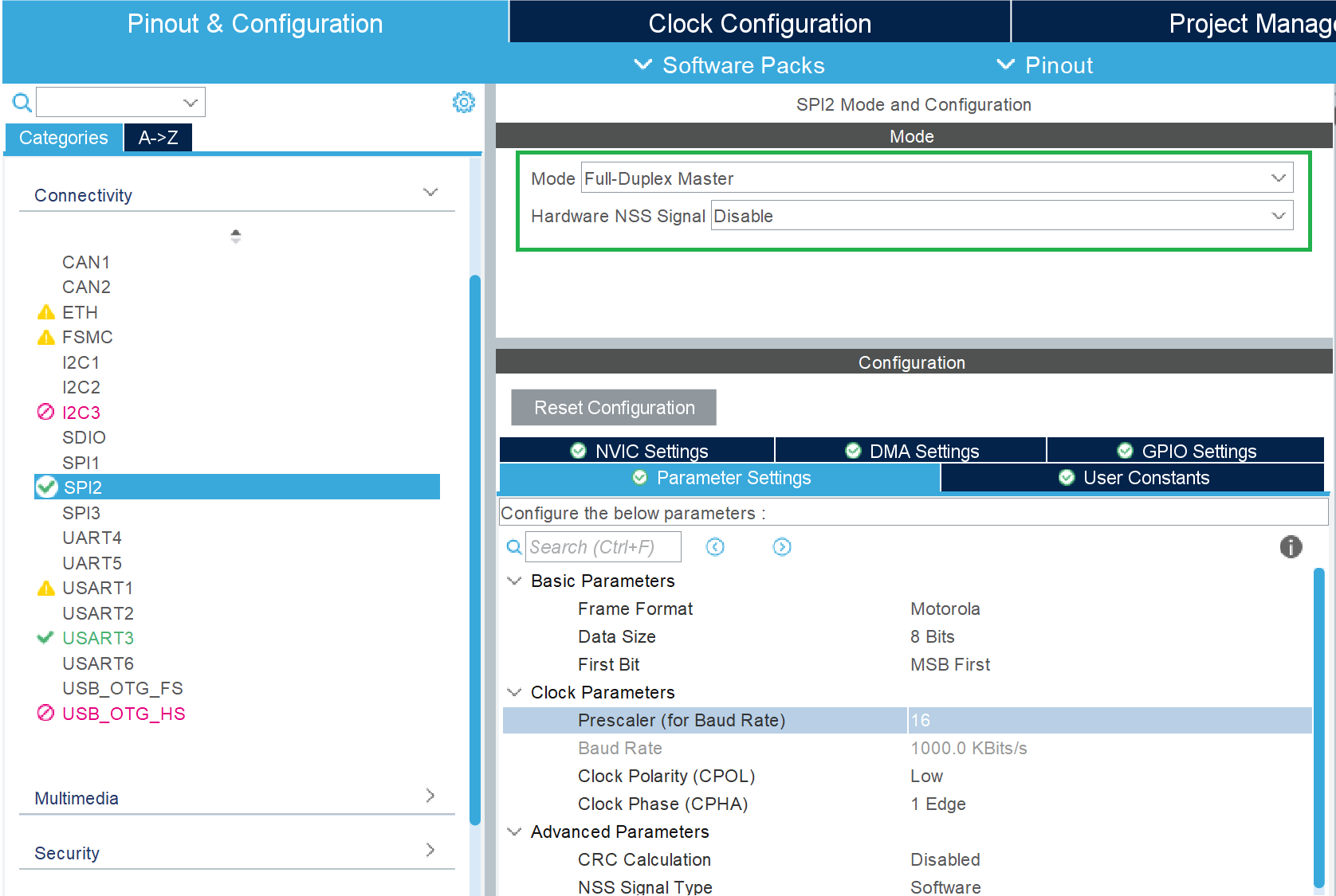 • Set Mode to Full-Duplex Master. SPI2 serves as controller.