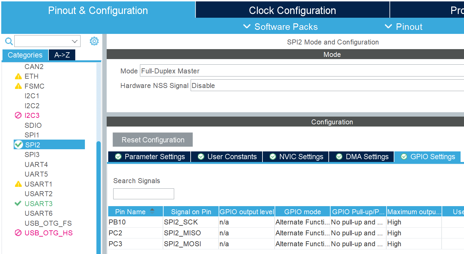 • Set Hardware NSS Signal to Disable. This prevents the SPI bus from controlling the CS line. Instead, use the GPIO pin (PB12) for the CS line.