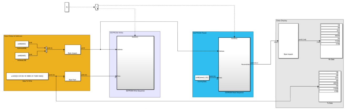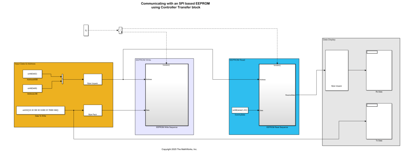 The example model spiEEPROMWithControllerTransferBlock.slx writes 32 bytes (eight packed uint32 values) to EEPROM address 0x0200 and reads back the same location to verify successful communication. It supports page-wise writes (16-byte pages).