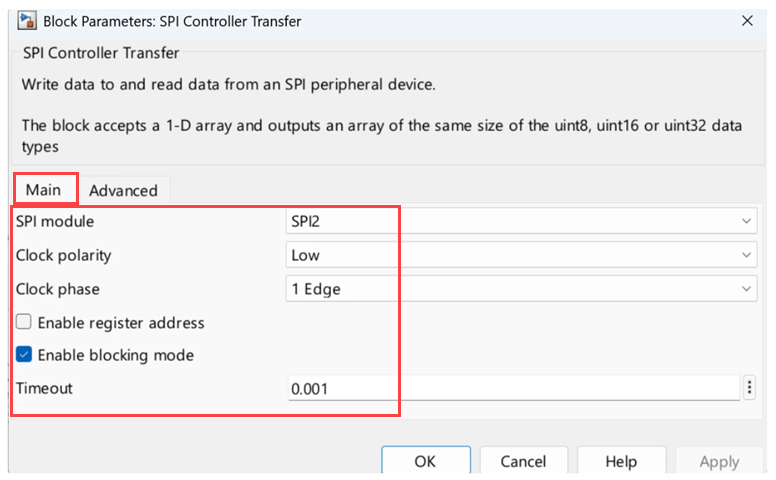Open the SPI Controller Transfer block from the spiEEPROMWithControllerTransferBlock.slx example model. Configure the SPI module as shown below (SPI2 in this example):