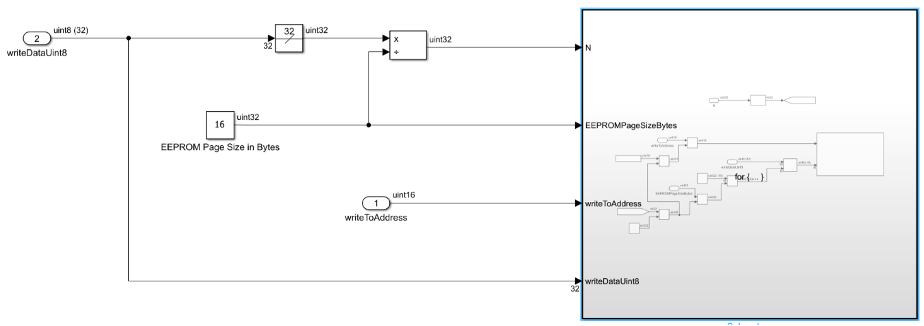 The example model spiEEPROMWithReceiveTransmitBlock.slx writes 32 bytes to EEPROM address 0x0200 and reads back the same location to verify successful communication. It uses separate subsystems for write enable, data transmit, write completion polling, and read operations.