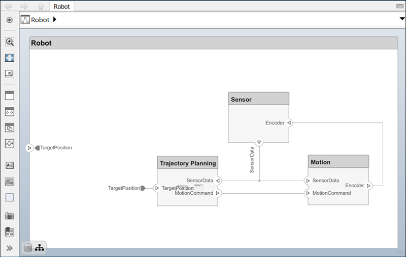 Abra el modelo de arquitectura de un brazo robótico que consta de sensores, actuadores de movimiento y un algoritmo de planificación. Puede utilizar System Composer para ver interfaces y gestionar requisitos del modelo.