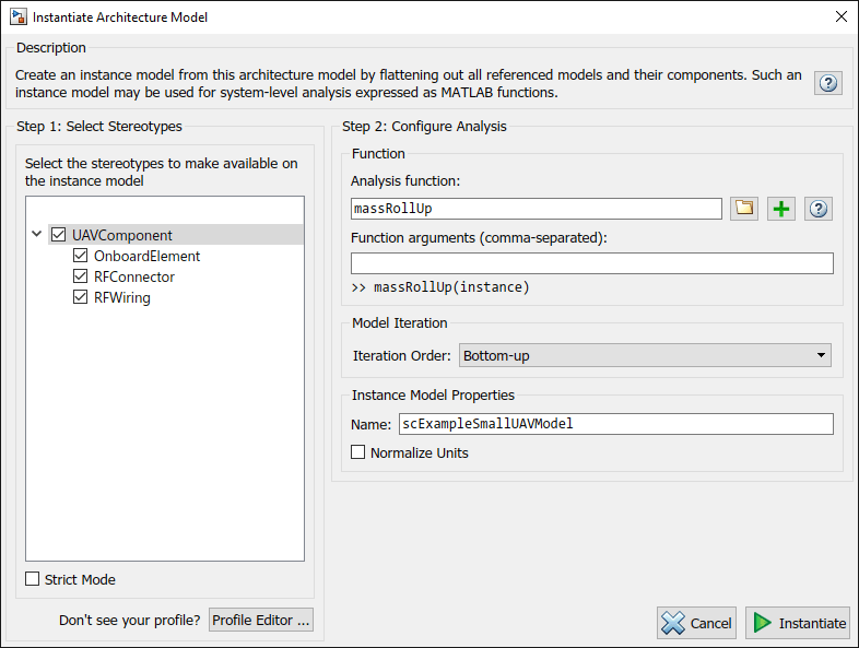 Uncheck Strict Mode so that all components can have a Mass property instantiated to facilitate calculation of total mass. Click Instantiate to generate an analysis.