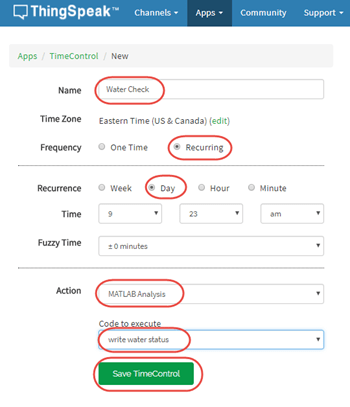 La aplicación TimeControl puede evaluar los datos de su canal ThingSpeak y activar otros eventos. Cree una instancia de la aplicación TimeControl que llame a su código de análisis MATLAB todos los días. Seleccione Aplicaciones > TimeControl y luego haga clic en Nuevo TimeControl.